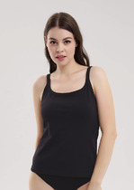 Укороченный облегающий топ на широких бретелях. Выполнен из трикотажной рибаны – в тонкий рубчи. Вырез формы «каре». Рекомендуем!
