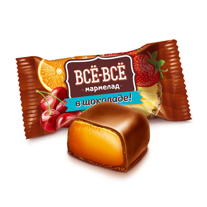 Много фруктов не бывает! Желейные конфеты в шоколаде «Всё-всё» – двойное удовольствие. Яркие желейные конфеты со вкусом искрящегося апельсина, сочной вишни, тропического ананаса и отборной клубники щедро покрыты шоколадной глазурью. Осторожно! Съев все-все конфеты за раз, можно легко зарядиться настроением фруктового коктейля!