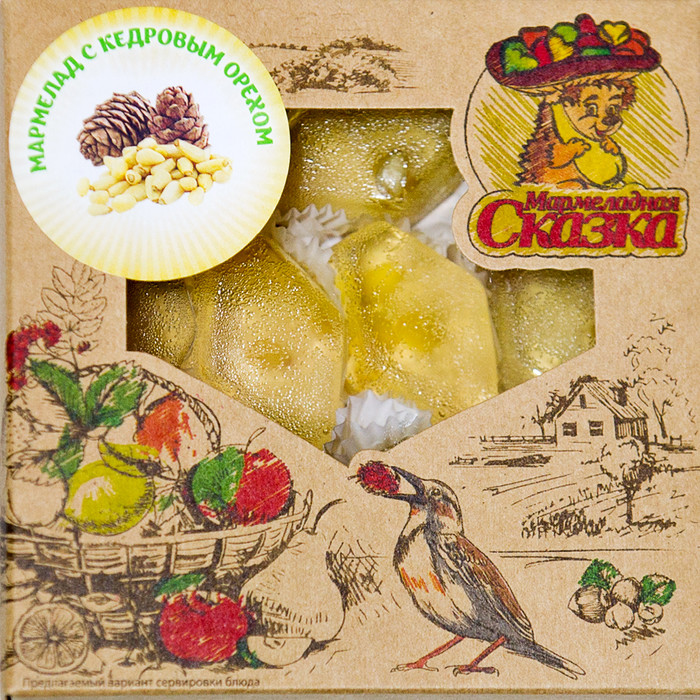 Состав: сахар-песок, патока, кедровый орех, агент желирующий – пектин, регулятор кислотности – кислота лимонная, глазирователь – пчелиный воск, ароматизатор натуральный карамель