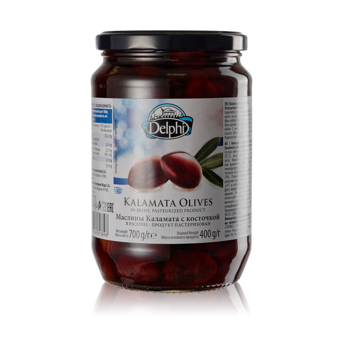 Описание Маслины Каламата с косточкой в рассоле Delphi Масса нетто 700г, масса основного продукта 400г Состав: Маслины Каламата с косточкой ( 57,1%); вода; морская соль; винный уксус. Возможно содержание фрагментов орехов. Продукт пастеризован, не содержит ГМО, готов к употреблению. Пищевая/энергетическая ценность на 100г: 249кКал/ 1025 кДж жиры 25,2г из них: насыщенные 3,5г; углеводы 2,7г из них: сахар <0,1г; белки 1,5г; соль 3,5г. Хранить при температуре от 0 °С до + 25 °С и относительной влажности воздуха не более 75%. Открытую упаковку хранить в холодильнике при температуре от +2°С до +6°С и употребить в течение 14 дней. Срок годности 36 месяцев. Изготовитель: «Intercomm Foods S.A.» 8th klm Larissa Sykourion, 41500 Larissa, Greece Интерком Фудс С.А., Страна происхождения Греция. Изготовлено в соответствии со спецификацией на оливки и маслины. Дата производства/ Годен до: смотри на крышке. На этикетке вариант сервировки.