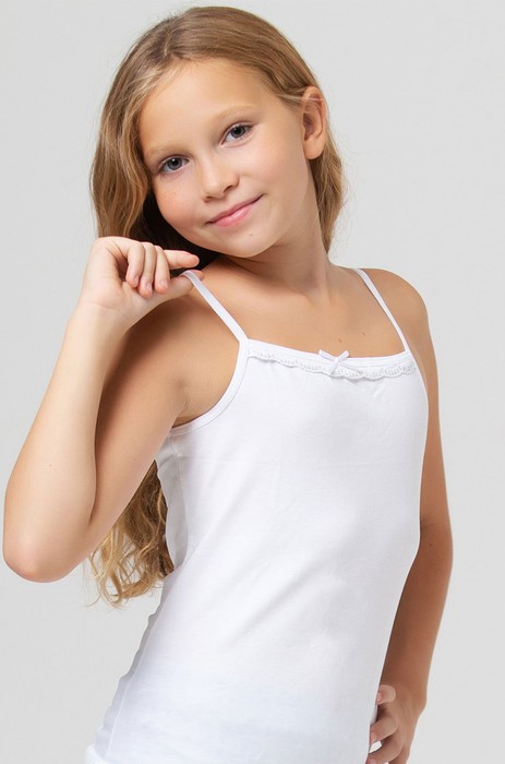 Бельевая майка для девочки и девочки подростка выполнена из качественного хлопкового трикотажа. Летняя однотонная маечка белого цвета украшена кружевным шитьем с люрексом и атласным бантиком.