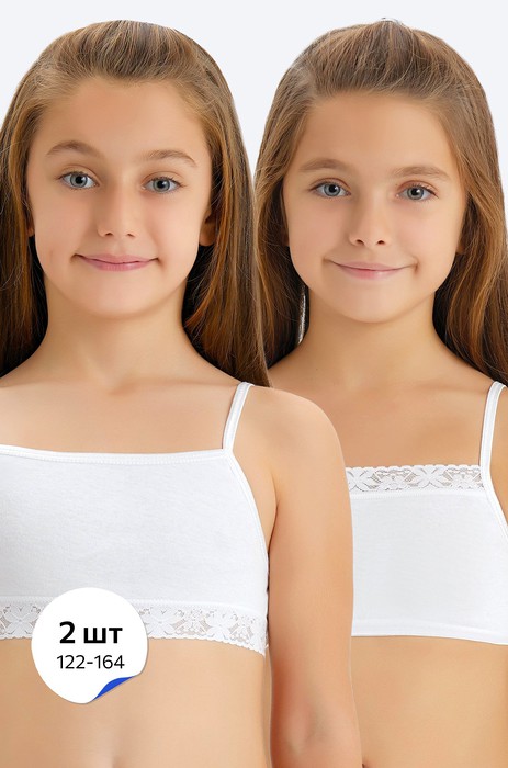 Набор детских бельевых топов на тонких бретелях 2 штуки для девочек и девочек-подростков выполнен из натурального гипоаллергенного хлопка. Топы-бюстье представлены в базовом белом цвете. Лифы понравятся юной принцессе благодаря легкой дышащей ткани и нежной кружевной оборке.