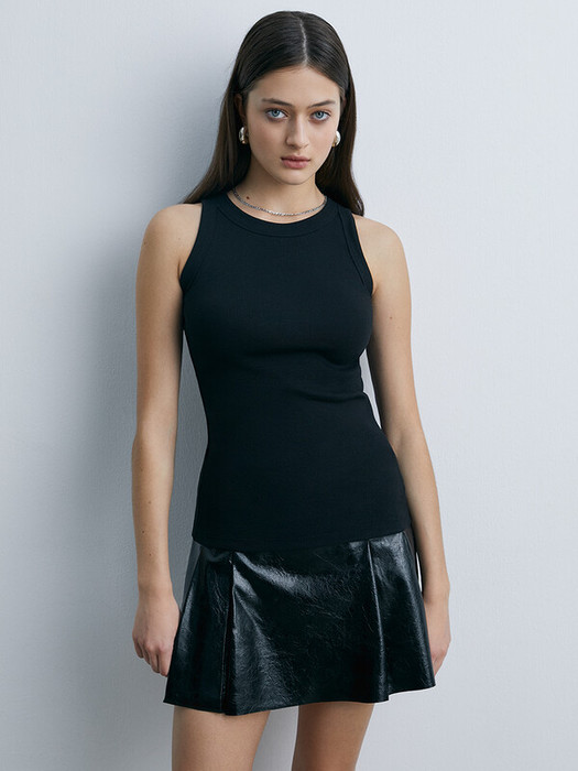 Женская майка в рубчик из трикотажа кашкорсе с округлым вырезом горловины  и открытыми проймами.  Горловина и проймы окантованы.