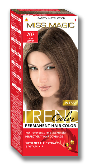 Miss Magic Trend Color краска для волос. Новая, улучшенная формула, щадящая во время окрашивания, предохраняющая волосы от обезвоживания и сохраняющая долгое время яркость цвета. В состав формулы входят витамин F и экстракт крапивы, а также эфирные масла авокадо, жожоба и миндаля. Краска обеспечивает равномерное и стойкое окрашивание, 100% закрашивание седины, удобное и быстрое применение с помощью сочетания геля-краски и окислителя. Благодаря экстракту крапивы и витаминам, волосы сохраняют мягкость, восхитительных блеск, объём и здоровый вид.