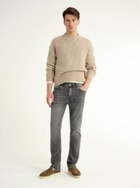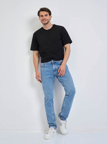 Мужские классические джинсы с пятью карманами. Посадка Regular fit (полуоблегающие по бедру), высокая талия, немного заужены к низу. Застежка на молнии. Выполнены из слабоэластичной ткани denim comfort stretch, цвет ткани Black/Black (лицевая и изнаночная стороны ткани черные). Темная стирка с потёртостями и "усами" спереди и потёртостями сзади.