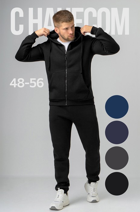 Теплый мужской костюм черного цвета выполнен из качественного трикотажа футер с начесом. В комплекте толстовка с регулируемым капюшоном и брюки джоггеры.