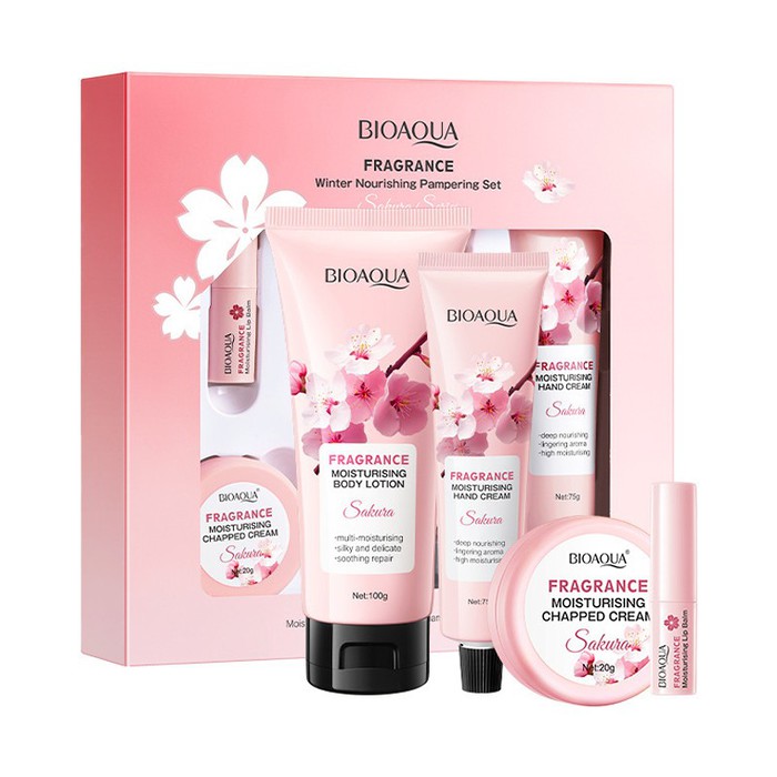 Набор состоит из: 1. Лосьон для тела с сакурой, 100 гр.Лосьон обладает легко впитывающейся текстурой и потрясающим ароматом, который превратит вашу процедуру ухода за кожей в момент наслаждения. Делает кожу мягче и красивее с каждым днем. 2. Крем для рук с сакурой, 75 гр.Крем для рук делает кожу нежной и бархатистой, смягчая сухие участки и препятствуя появлению шелушений.