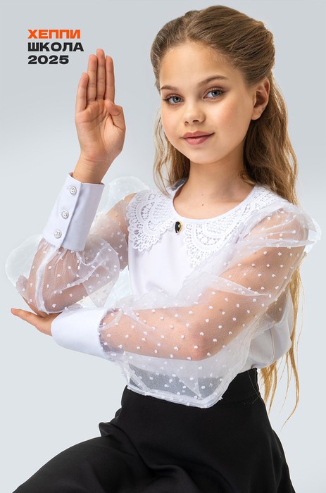 Лёгкое романтичное настроение, плавные формы, воздушная ткань — те акценты, которые повышают твою запредельную харизму! Школьная блузка для девочек выполнена из вискозы. Оригинальные детали блузы – воздушные прозрачные рукава в горошек на широких манжетах с пуговицами, круглый ворот из ажурного кружева кроше, декорированный стразой. Сзади, для удобства одевания, предусмотрена застежка-капелька на пуговицу.