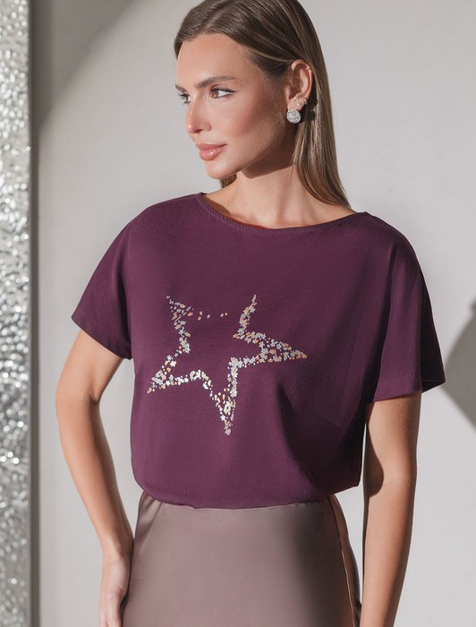 Состав: 92%Хлопок 8%ПУ Плотность: 150 Г/м2Футболка цвета бургунди идеально подходит для вечеринки и создания яркого образа. Оригинальный принт из фольги в виде звезды придает изделию шикарный вид, который привлечет внимание на любом мероприятии. Модель с вырезом лодочка и цельнокроеным рукавом обеспечивает свободу движений и комфорт в носке. Такой фасон изделия подходит на большие размеры, гармонично сидит на фигуре и помогает создать легкий акцент на достоинствах. Благодаря особенностям кроя с цельнокроеным рукавом удается искусно скроет любые возможные недостатки в области плеч и рук, обеспечивая комфортное прилегание без ощущения скованности. Аккуратный вырез лодочка красиво подчеркивает шею и делает образ элегантным, сохраняя актуальность для разных случаев — от рабочих встреч до вечерних прогулок и праздничных мероприятий.