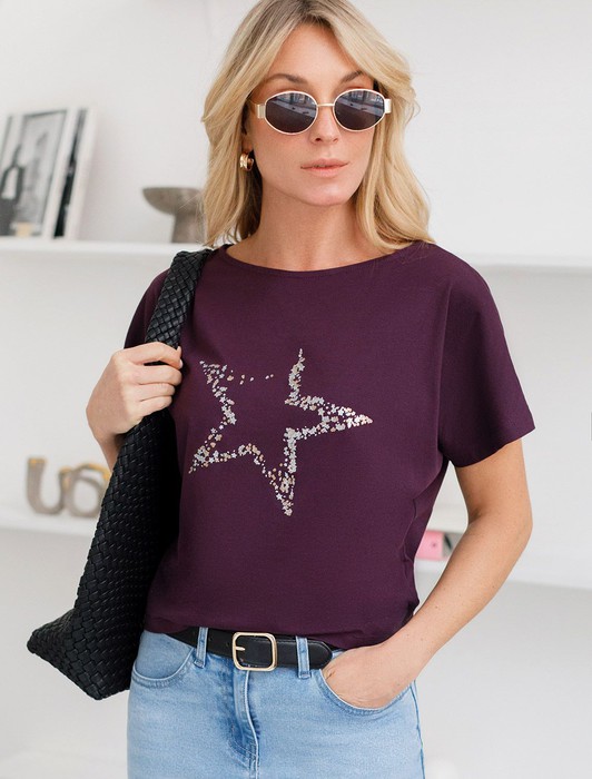 Состав: 92%Хлопок 8%ПУ Плотность: 150 Г/м2Футболка цвета бургунди идеально подходит для вечеринки и создания яркого образа. Оригинальный принт из фольги в виде звезды придает изделию шикарный вид, который привлечет внимание на любом мероприятии. Модель с вырезом лодочка и цельнокроеным рукавом обеспечивает свободу движений и комфорт в носке. Такой фасон изделия подходит на большие размеры, гармонично сидит на фигуре и помогает создать легкий акцент на достоинствах. Благодаря особенностям кроя с цельнокроеным рукавом удается искусно скроет любые возможные недостатки в области плеч и рук, обеспечивая комфортное прилегание без ощущения скованности. Аккуратный вырез лодочка красиво подчеркивает шею и делает образ элегантным, сохраняя актуальность для разных случаев — от рабочих встреч до вечерних прогулок и праздничных мероприятий.