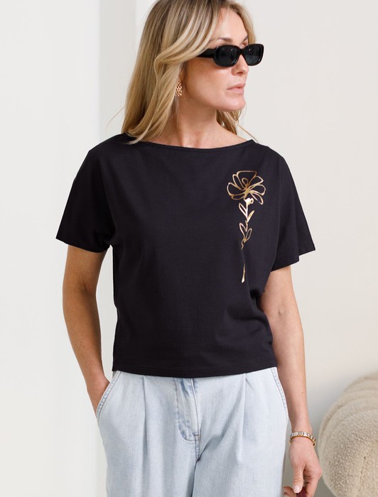 Состав: 92%Хлопок 8%ПУ Плотность: 150 Г/м2Футболка черного цвета идеально подходит для вечеринки и создания яркого образа. Оригинальный блестящий принт из фольги в виде цветка придает изделию шикарный вид, который привлечет внимание на любом мероприятии. Модель с вырезом лодочка и цельнокроеным рукавом обеспечивает свободу движений и комфорт в носке. Такой фасон изделия подходит на большие размеры, гармонично сидит на фигуре и помогает создать легкий акцент на достоинствах. Благодаря особенностям кроя с цельнокроеным рукавом удается искусно скроет любые возможные недостатки в области плеч и рук, обеспечивая комфортное прилегание без ощущения скованности. Аккуратный вырез лодочка красиво подчеркивает шею и делает образ элегантным, сохраняя актуальность для разных случаев — от рабочих встреч до вечерних прогулок и праздничных мероприятий.