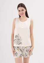 Сорочка женская из трикотажного полотна «кулирка» с набивным рисунком, расширенная книзу, без рукавов, с расширенной, углубленной горловиной овальной формы и притачной кокеткой по переду. Срезы пройм и горловины, а также шов притачивания кокетки, обработаны фасонной эластичной тесьмой с кружевным краем. Низ изделия обработан узкой обметочной строчкой.