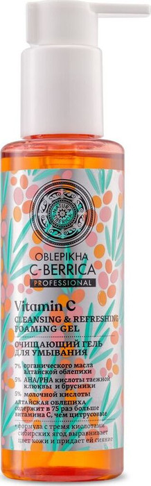 Состав : Aqua with infusioNatura Siberica of Hippophae Rhamnoides Fruit WaterWHH (органический гидролат алтайской облепихи), Vaccinium Macrocarpon Fruit Extract* (органический экстракт клюквы), Vaccinium Vitis-Idaea Fruit Extract* (органический экстракт брусники), Astragalus Membranaceus ExtractWH (экстракт астрагала тибетского), Scutellaria BaicaleNatura Sibericais Root Extract* (экстракт шлемника байкальского), Trifolium PrateNatura Sibericae Flower Extract* (экстракт клевера красного), Vaccinium Myrtillus Fruit Extract* (экстракт черники), Aralia Mandshurica Leaf/Stem WaterWH* (гидролат аралии маньчжурской); Sodium Coco-Sulfate, Cocamidopropyl Betaine, Lauryl Glucoside, Hippophae Rhamnoides Fruit Oil* (органическое масло облепихи), Coco-Glucoside, Glyceryl Oleate, Lactic Acid (молочная кислота), Sodium Ascorbyl Phosphate (витамин С), Citric Acid, Sodium Hydroxide, Sodium Chloride, Benzyl Alcohol, Sodium Benzoate, Potassium Sorbate, Parfum, CI 15985. (WHH) – гидролаты дикосборного органического растения *-Органические ингредиенты (WH) – Органические экстракты дикорастущих растений Сибири.
