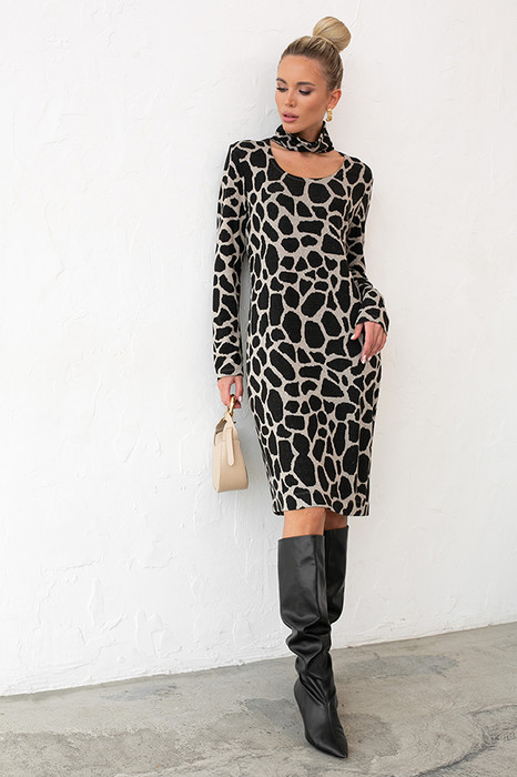 Платье полуприлегающего силуэта из эластичного полотна с жаккардовым анималистичным узором. Втачной длинный рукав. Оригинальный вырез горловины оформлен воротником-стойкой.