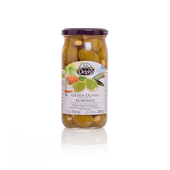 Зеленые оливки Delphi, фаршированные миндалем, являются классическим деликатесом. Хрустящий миндаль и мягкая зеленая оливка, объединившись, делают непревзойденную комбинацию. Может употребляться как самостоятельно, так и в виде превосходной закуски к крепким алкогольным напиткам.