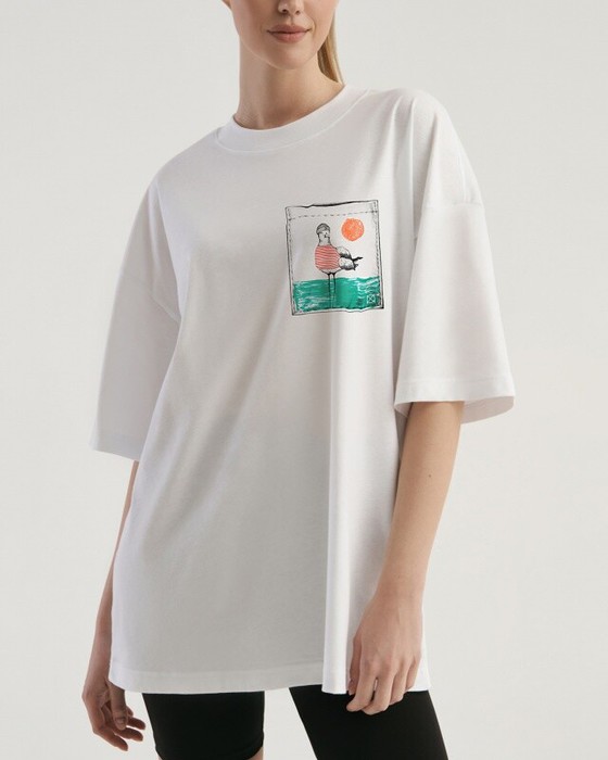 Футболка свободного силуэта. Спущенное плечо. Горловина из двух деталей, из рибаны.
