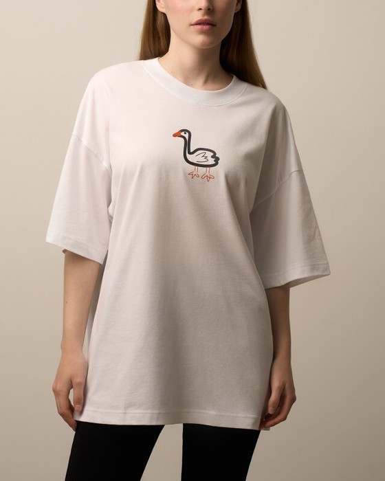 Футболка свободного силуэта. Спущенное плечо. Горловина из двух деталей, из рибаны.