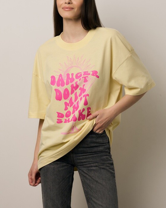 Футболка свободного силуэта. Спущенное плечо. Горловина из двух деталей, из рибаны.