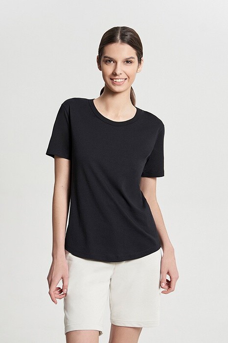 Женская футболка полуприлегающего силуэта с фигурным низом. Горловина окантована.
