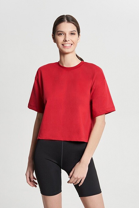 Укороченная футболка CROP, спущенное плечо. Горловина из рибаны. Укрепление по шву горловины спинки и плечевым швам бейкой из основной ткани.