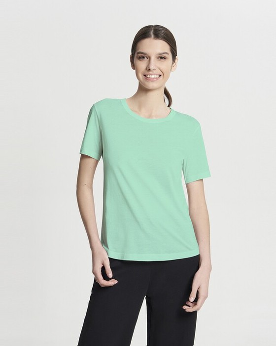 Женская футболка полуприлегающего силуэта. Горловина окантована.