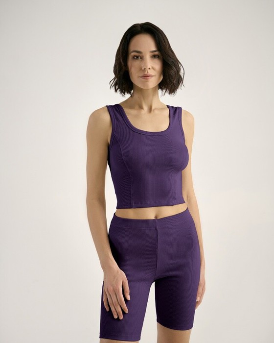 Майка из кашкорсе, облегающая с отстроченными рельефами. Горловина и проймы окантованы основной тканью
