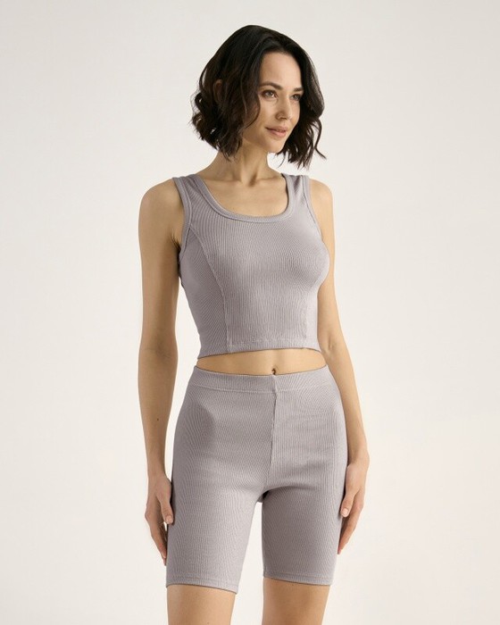 Майка из кашкорсе, облегающая с отстроченными рельефами. Горловина и проймы окантованы основной тканью