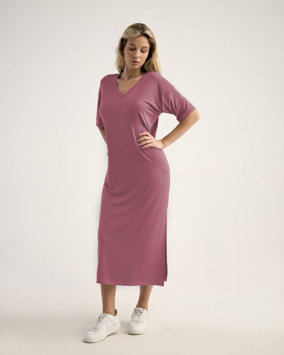 Платье, длина макси с высоким разрезом в левом боковом шве. Спущенное плечо.Втачной короткий рукав. V- вырез.Горловина окантована бейкой из основной ткани.