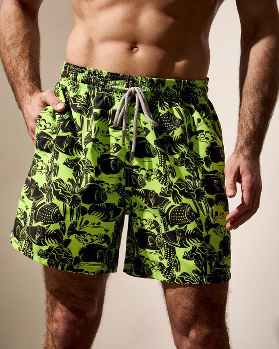 Плавательные шорты. Карманы в боковых швах. Задний карман с клапаном на правой задней половинке шорт. Пояс цельнокроенный, отстроченный, внутри с резинкой и шнурком.