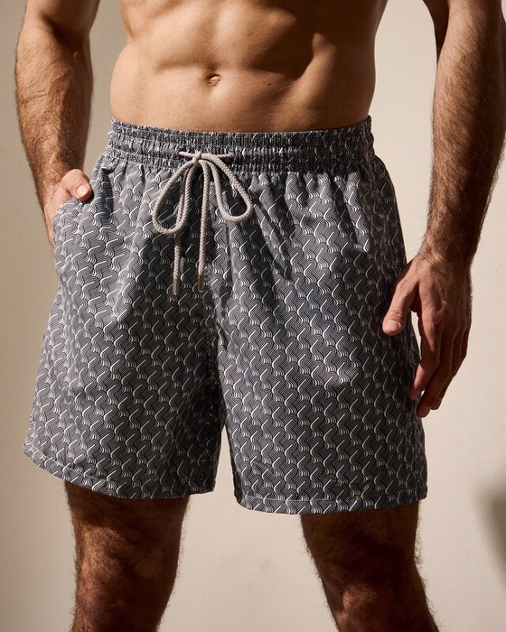 Плавательные шорты. Карманы в боковых швах. Задний карман с клапаном на правой задней половинке шорт. Пояс цельнокроенный, отстроченный, внутри с резинкой и шнурком.