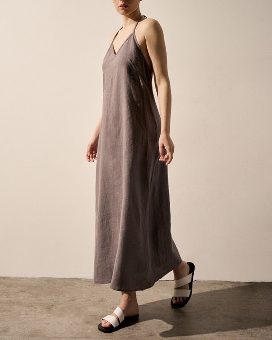 Сарафан длинный из льна с V-образным вырезом . Открытая спинка Завязывается на шее.
