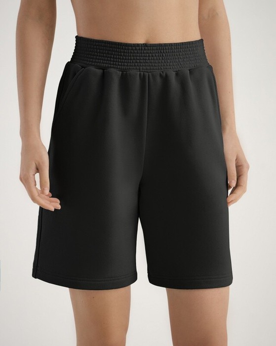 Удлиненные шорты. Пояс из основной ткани, отстроченный, боковые карманы.