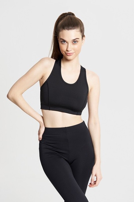 Топ спортивный из эластичной ткани. Лиф полочки двойной. Горловина и проймы окантованы.