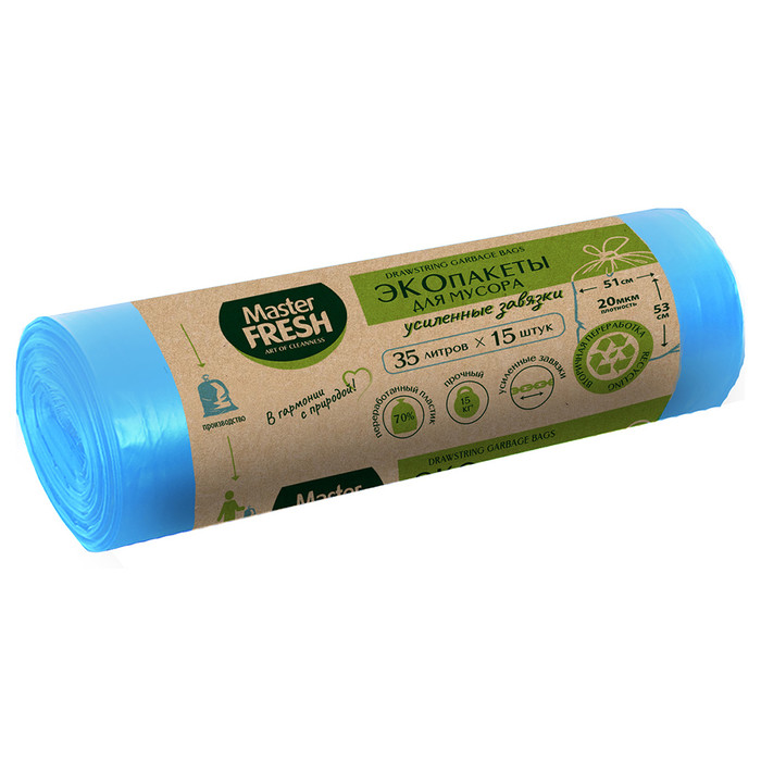 Прочные эко-пакеты для мусора Master Fresh на 70% производятся из вторичного переработанного сырья. Подлежат последующей переработке. Таким образом, сокращается вред, наносимый окружающей среде. Повышенная плотность эко-пакетов Master Fresh позволяет выдерживать нагрузку до 15 кг! Они оснащены усиленными завязками, которые выдерживают вес до 10 кг. Практичные и удобные в применении эко-пакеты мягкие на ощупь, из всей линейки пакетов для мусора их выделяет небесно-голубой цвет. Оптимальный размер пакетов идеально подходит для ведра объемом 15 л.