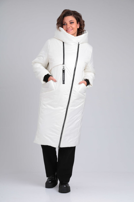 Пальтто женское утеплённое с ассиметричной застёжкой"молния" от горловины до низа. Перед с плечевой застёжкой по правой полочке, пристёгнутый на короткую молнию с карабином и "украшением". Карманы боковые прорезные с листочкой. Спинка с отлетной кокеткой. Пальто с отрезными бочками. Воротник капюшон с кулисой и шнуром по средней части для коррекции объёма. Рукав втачной 2-х шовный с трикотажным довязом выглядывающим из под низа рукава. Температурный режим до -15 градусов