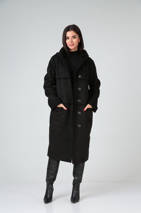 Пальто зимнее, полуприлегающего силуэта с  центральной застёжкой на петли-пуговицы,с капюшоном. По полочкам и спинке- горизонтальные рельефы по линии груди и бёдрам. Рукав - втачной одношовный. Материал искусственный дубляж. Температурный режим до -5 градусов.