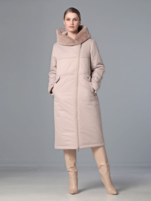 Стильное зимнее пальто средней длины с ассиметричной застежкой на двухзамковую молнию, которая расстегиванием снизу, позволяет регулировать ширину шага при подъеме и ходьбе. Прямой силуэт можно скорректировать затяжкой на талии, увеличив тем самым прилегание по спинке. Капюшон оформлен меховой опушкой, не отстегивается. Модный искусственный мех  хорошо стирается и не меняет свой красивый внешний вид после высыхания. Длину втачного рукава можно регулировать отворотом. Комфортности добавляют удобно расположенные  карманы с молнией. Есть внутренний кармашек, тоже на молнии.  Модель этого пальто рекомендована женщинам и девушкам любой возрастной категории. Оно универсально  - его можно сочетать как с платьями и юбками, так и с джинсами и брюками.  Плащевая ткань имеет водоотталкивающую пропитку,  которая выдержит небольшой  дождь или снег. Хорошо зарекомендовавший себя современный утеплитель Холлофайбер, плотностью 300 г/м, защитит от холода и  ветра. Подкладка в изделии - в мелкую полоску.