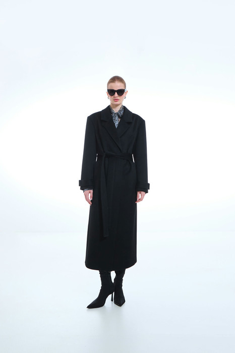 Пальто женское демисезонное, однобортное, прямого силуэта, длина миди. Застежка на пришивные кнопки. Перед с карманами в рельефе переда. Рукав длинный, одношовный с патой пристегивающуюся на пришивную кнопку. Воротник и лацкана отложные. Пальто на подкладке и со съемным поясом.