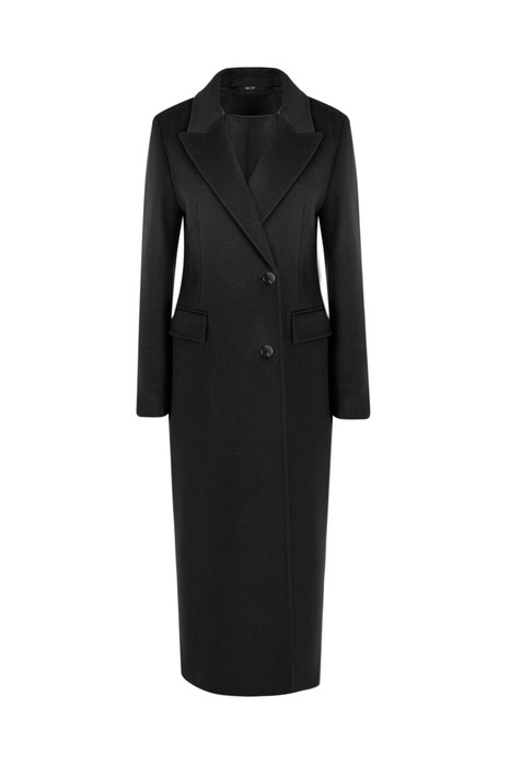 Пальто женское демисезонное, прилегающего силуэта двубортное, длиной ниже колен, на подкладке. На переде карманы с клапаном, застежка на пуговицы и петли. Спинка со средним швом, в нижней части которого шлица. Воротник и лацкана отложные. Рукава длинные, двухшовные, в нижней части локтевого шва отлетная шлица на 4 петли и пуговицы.
