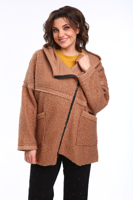 Женское полупальто для повседневной носки выполнено из пальтовой ткани средней плотности, без подкладки. Ткань с эффектом букле. Полупальто длиной до бедер свободного кроя с капюшоном. Плечо спущенное, рукав длинный втачной. Перед изделия с асимметричной косой застежкой на разъемную тесьму-молнию. Спинка прямая цельная. Полупальто украшено рельефными швами срезами наружу. По переду накладные карманы. Низ изделия разноуровневый с необработанным краем. Полупальто смело сочетается с любым низом (юбка, брюки, джинсы) и обувью. Длина по спинке 75 см, длина рукава от горловины 74 см. Изделие подойдет на рост 170 см.