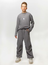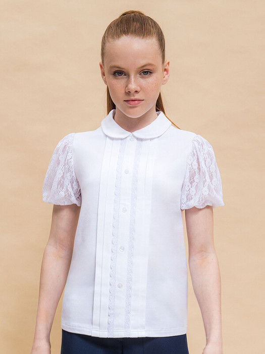 Джемпер из мягкого хлопкового трикотажа с небольшим содержанием эластана, полуприлегающего силуэта, с отложным круглым воротником на цельнокроеной стойке. По центру переда планка с декоративными пуговицами, вдоль которой застрочены вертикальные складки и кружево с фестонным краем. По спинке застежка на две пуговицы. С коротким объёмным рукавом на подкладе из тонкой сетки. По низу рукав присборен на шпульную резину.