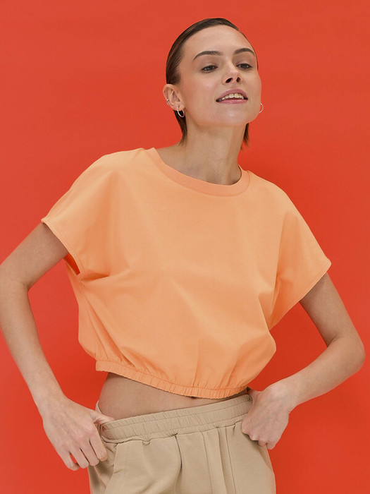 Женский кроп-топ с короткими цельнокроеными рукавами. В составе ткани преобладает хлопок — изделие приятно на ощупь и отлично подходит для жаркой погоды. Эластан помогает сохранять форму. Горловина с классическим округлым вырезом отделана рибаной, она долго не теряет форму. Низ модели собран на широкую резинку - это создаёт актуальный силуэт заправленной внутрь футболки. Такой топ благодаря лаконичному дизайну великолепно сочетается с различными шортами и брюками.