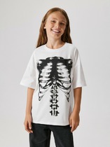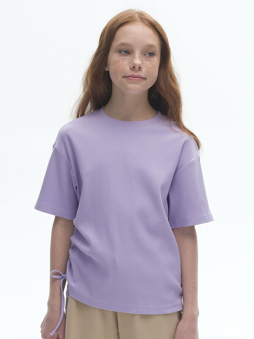 Футболка из модной ткани в рубчик для девочки. Благодаря преобладающим в составе хлопку и вискозе ткань изделия дышит и приятна на ощупь.  Эластан помогает сохранять форму. По бокам модели кулиски с тесьмой — актуальный тренд. С их помощью можно делать стильную сборку с одной или двух сторон. Такая футболка хорошо сочетается с различными шортами, леггинсами, кюлотами или джоггерами.