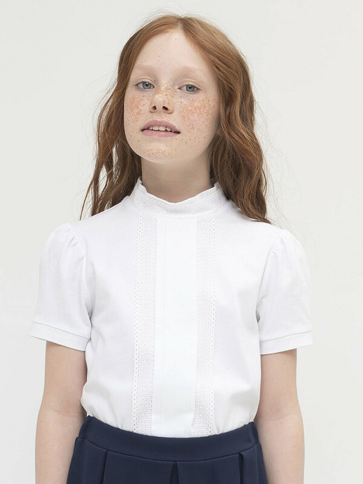 Кружево по бокам центральной складки спереди и по воротнику, а также лёгкая сборка рукава вносят немного романтики в классический стиль.