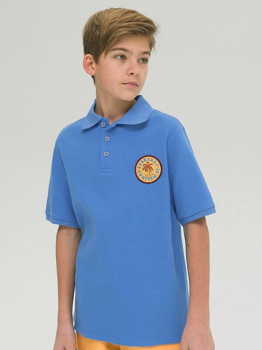 Футболка-поло для мальчика. Приятный на ощупь, 100% хлопка в составе, гигроскопичный и простой в уходе вафельный трикотаж. Умеренный объем, прямой силуэт для комфорта движений. Воротник сделан из основной ткани, планка у горловины на пуговице. Цветная круглая эмблема спереди – фишка модели. Подходит на каждый день, для активного образа жизни, идеальна для пляжного сезона.