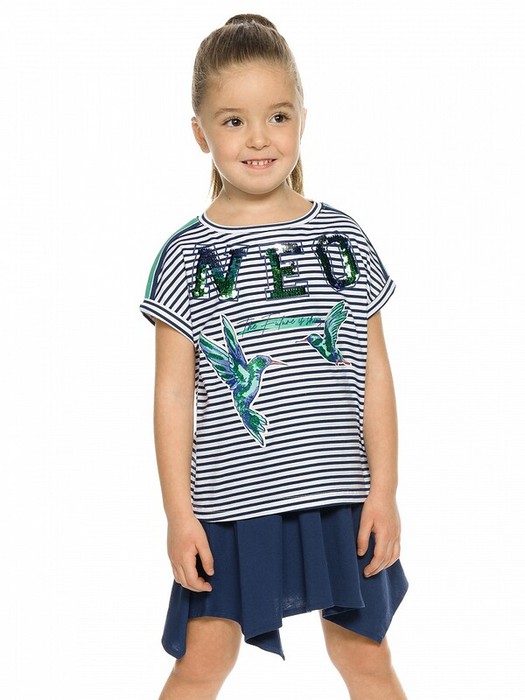 Комплект для девочек футболка и юбка. Футболка свободного объёма с цельнокроеным рукавом с отгибающейся закрепленной манжетой. Вдоль линии плеч настрочена декоративная трикотажная тесьма.  По переду изделия принт с разноцветным глиттером в виде птичек колибри  и надписи, перевод  Блестящее будущее , и вышивка из переливающихся переворачивающихся пайеток. Юбка - Новинка. Прямоугольная юбка с фигурной угловатой линией низа, пояс на широкой внутренней резинке.
