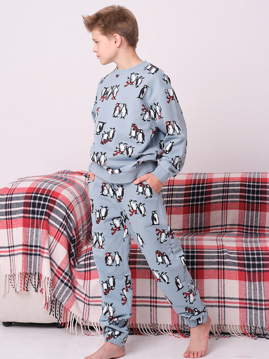 Костюм двойка для мальчика состоит из свитшота и брюк умеренного объёма. В поясе и по низу брюк мягкие и широкие резинки — не перекручиваются и не давят. Манжеты и отделка горловины из эластичной рибаны — они не растягиваются, джемпер удобно надевать и снимать.