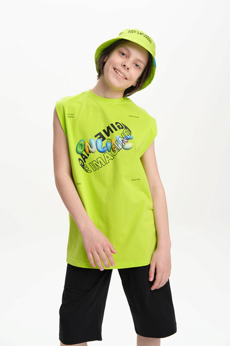 Летняя майка для мальчика свободного силуэта. Выполнена из 100% хлопка. Горловина из рибаны - голова не застрянет. По переду украшена ярким принтом с персонажем из игры Pac-man (пакмен) с надписями. Перевод надписей: "let's be creative" - будь креативный, "think bold" - думай смелее, "enjoy" - наслаждайся, "have fun" - веселись. Футболка без рукавов отлично подойдет для занятий спортом, походов на пляж и прогулок.