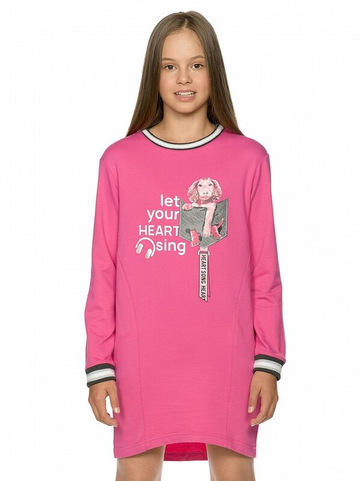 Платье для девочек из футера свободного силуэта со слегка спущенным плечом, зауженное книзу, боковые швы переведены на перед, перепад длины переда и спинки, рукав умеренного объема, горловина и манжеты рукавов из рибаны с люрексом. Мягкий эластичный принт с серебряным блеском. Перевод Позволь своему сердцу петь и Музыка сердца.