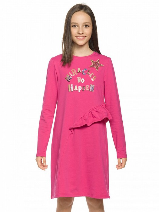 Платье для девочек из футера А силуэта. Аккуратный втачной рукав, небольшая горловина. Фишка декоративный асимметричный рельеф необычной округлой формы по переду и по спинке до низа изделия. В рельеф вставлен волан. Rubber принт с золотым металликом и глиттером. Надпись Чудеса случаются. Вуаля.